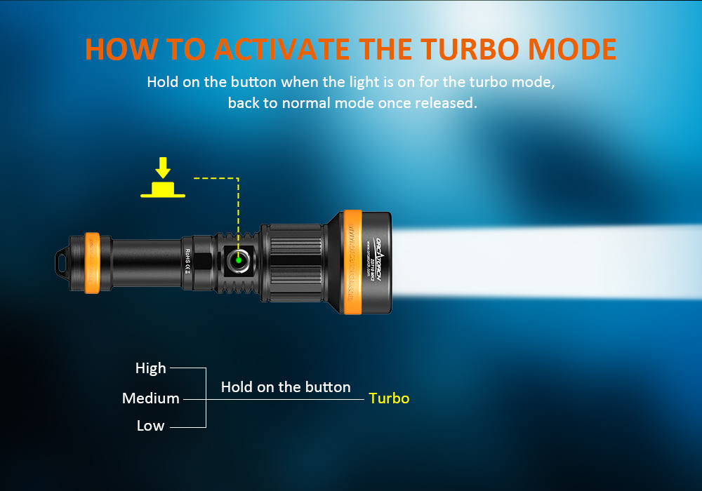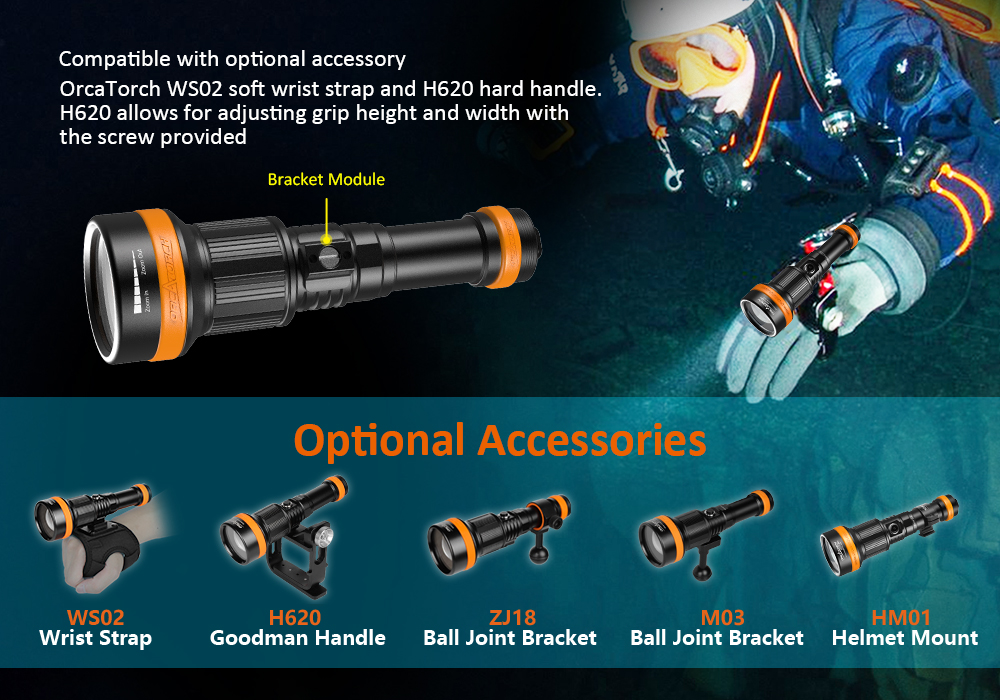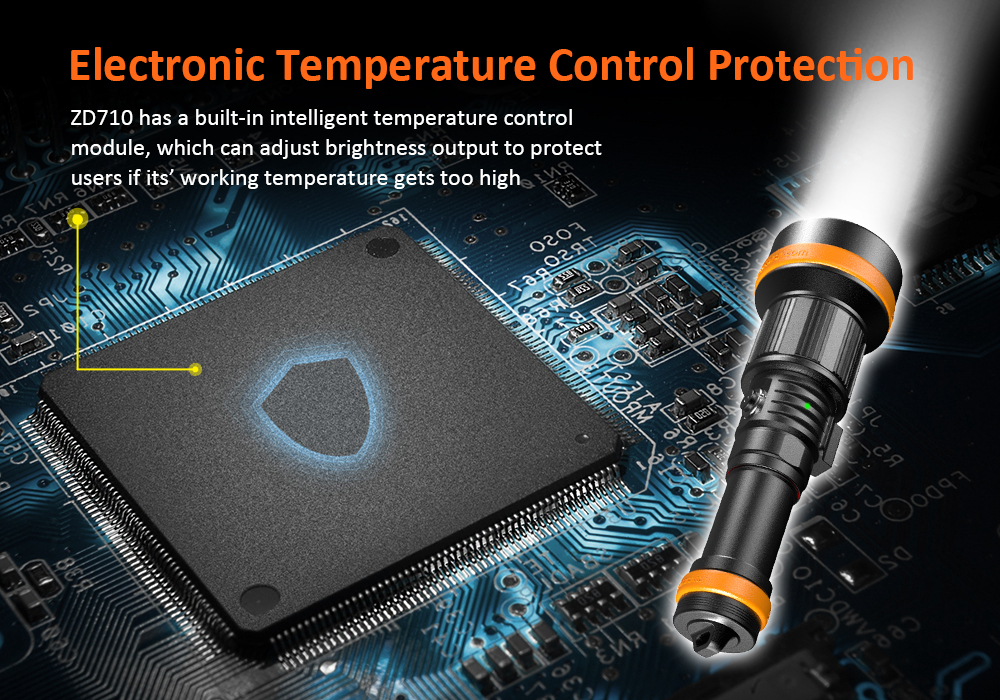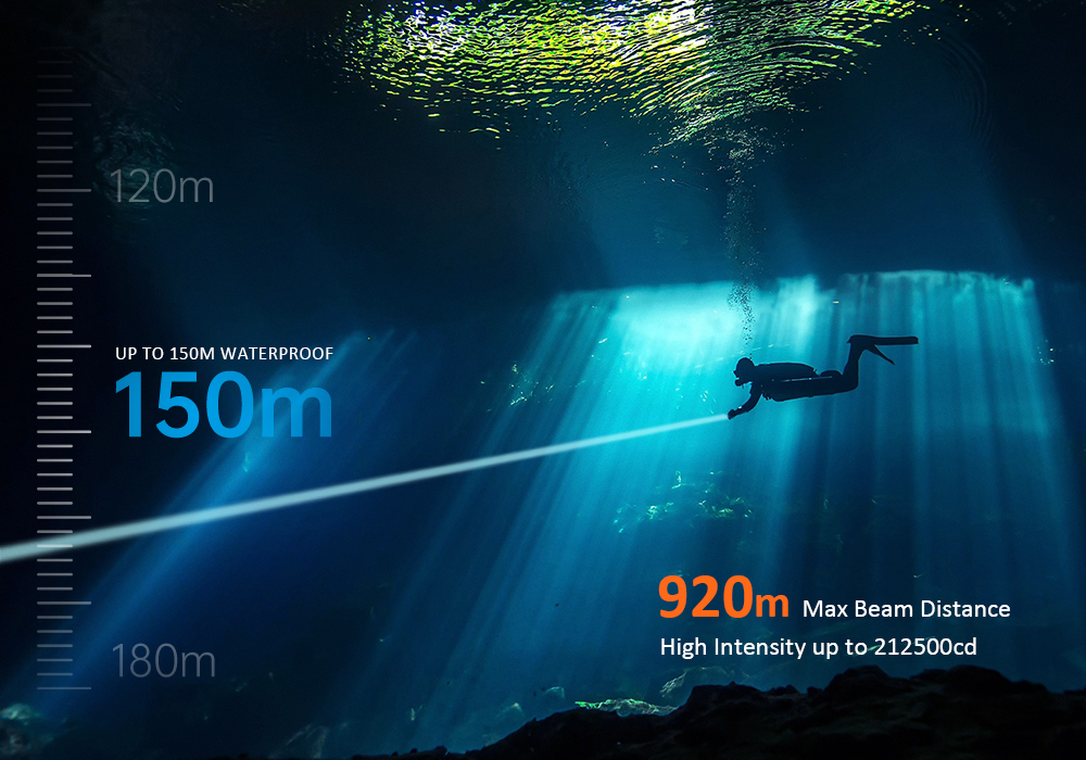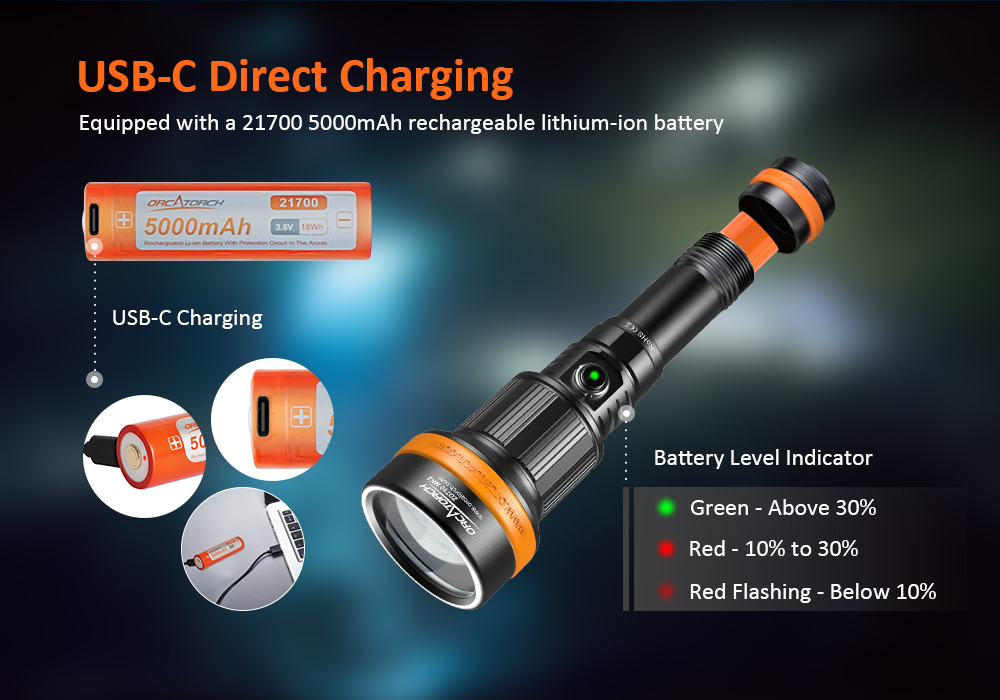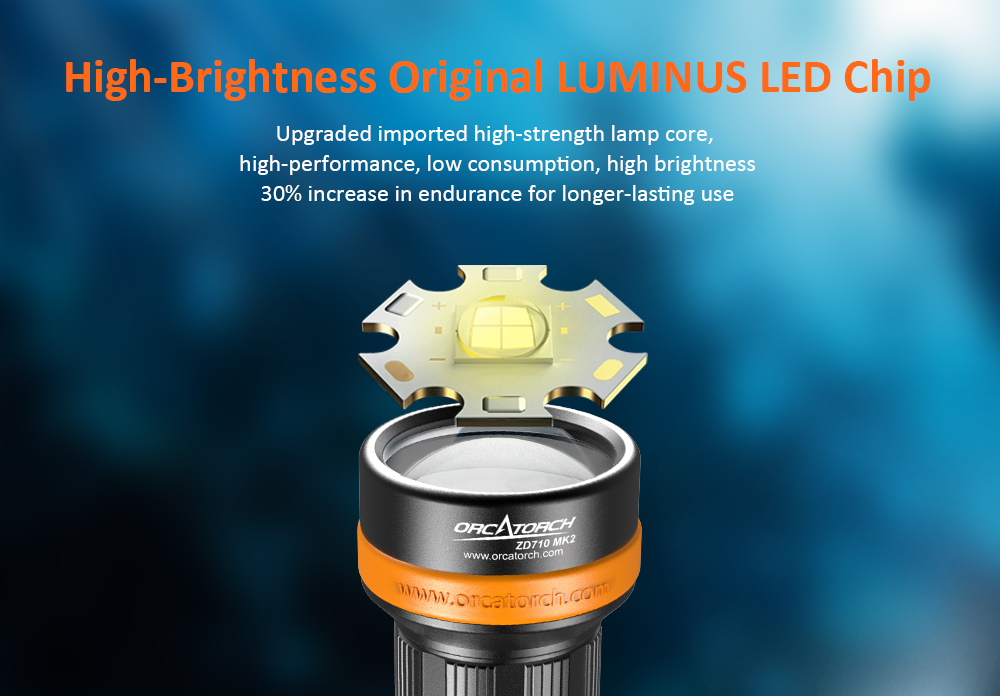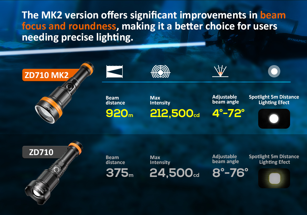 - The OrcaTorch ZD710 MK2 is a versatile underwater dive light with an adjustable beam angle, max beam intensity 212500cd and beam distance of 920 meters. Its adjustable beam angle (4° to 72°) provides flexibility for diverse underwater lighting needs, whether exploring caves, observing marine life, underwater photography, etc. The ZD710 MK2 is equipped with a 5000mAh 21700 USB-C rechargeable battery for convenient charging. It features a safe lock fuction to prevent accidental activation, making it an ideal dive light for depths of up to 150 meters, capable of adapting to various underwater environments.