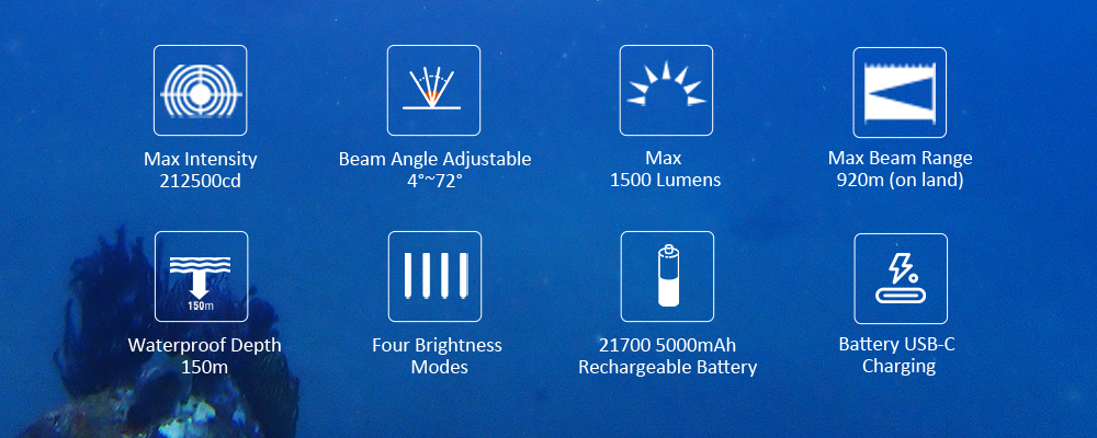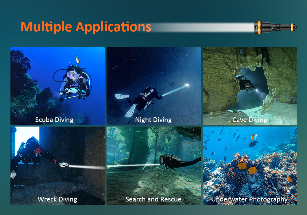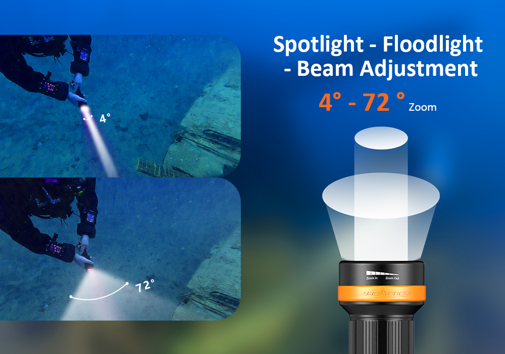 * Adjustable beam angle from 4° to 72° for various divings